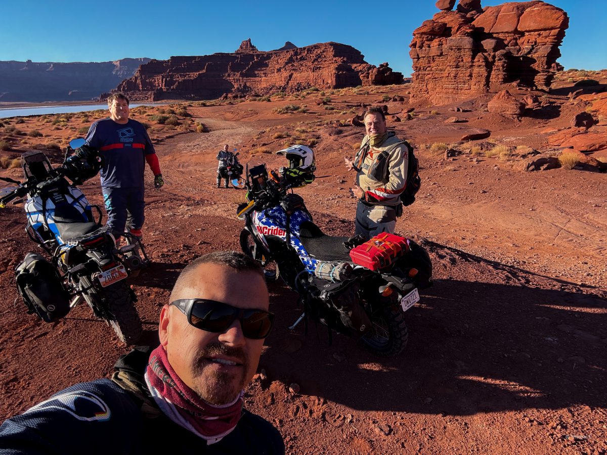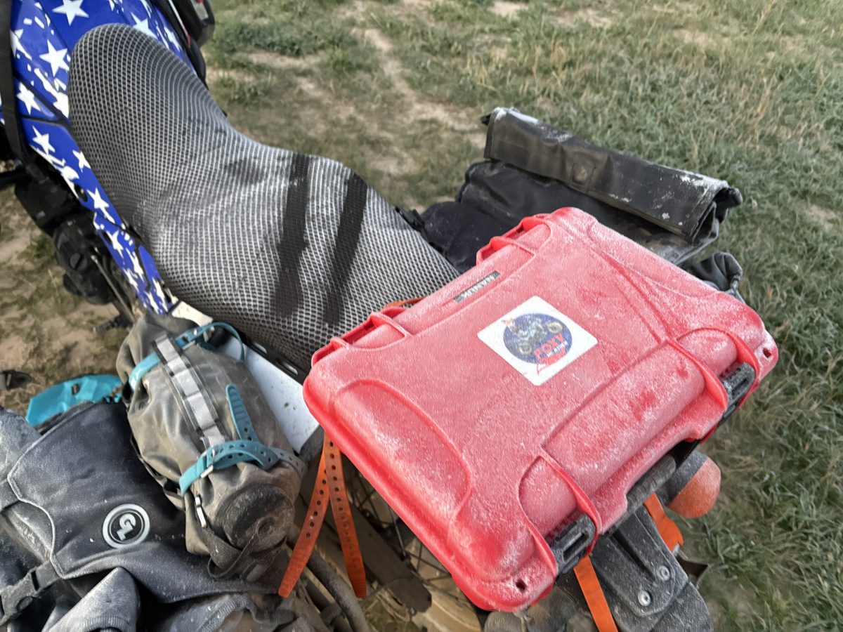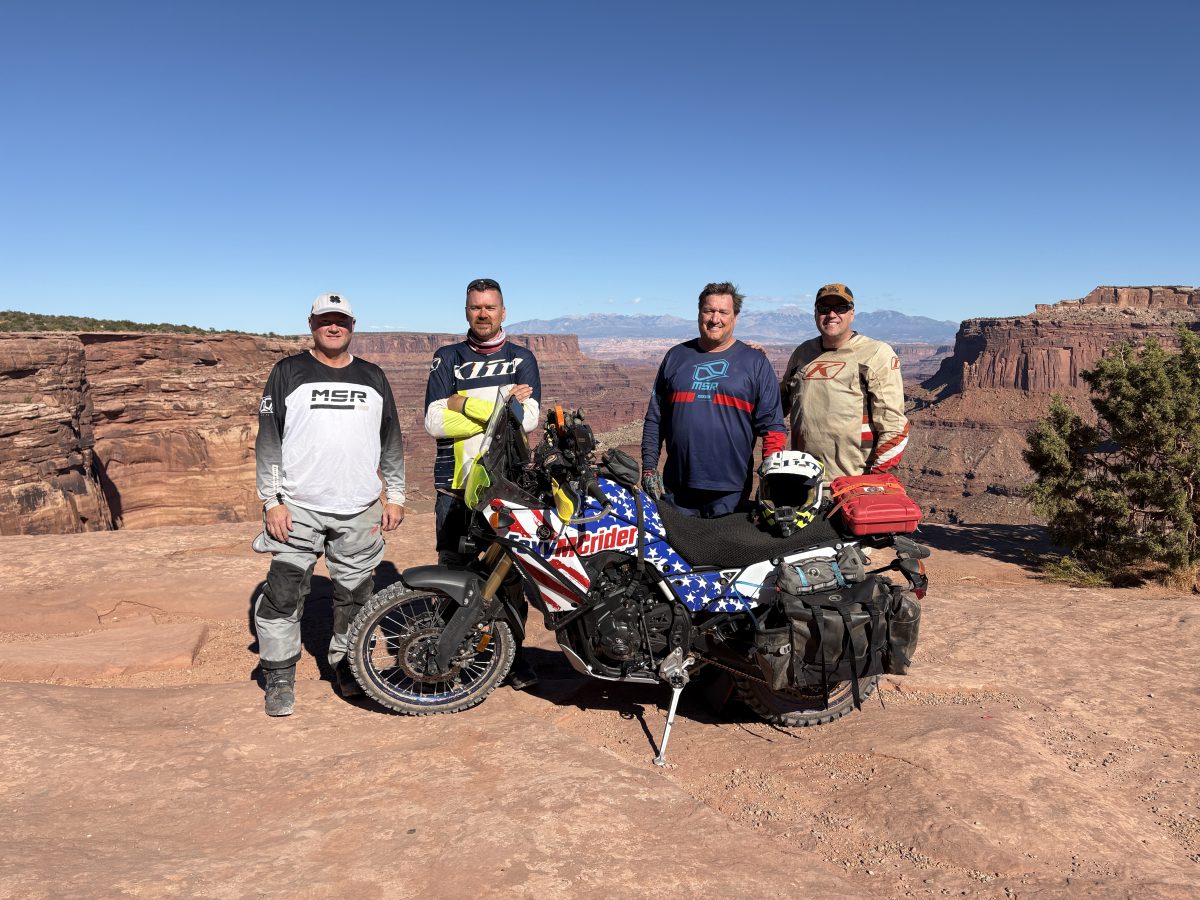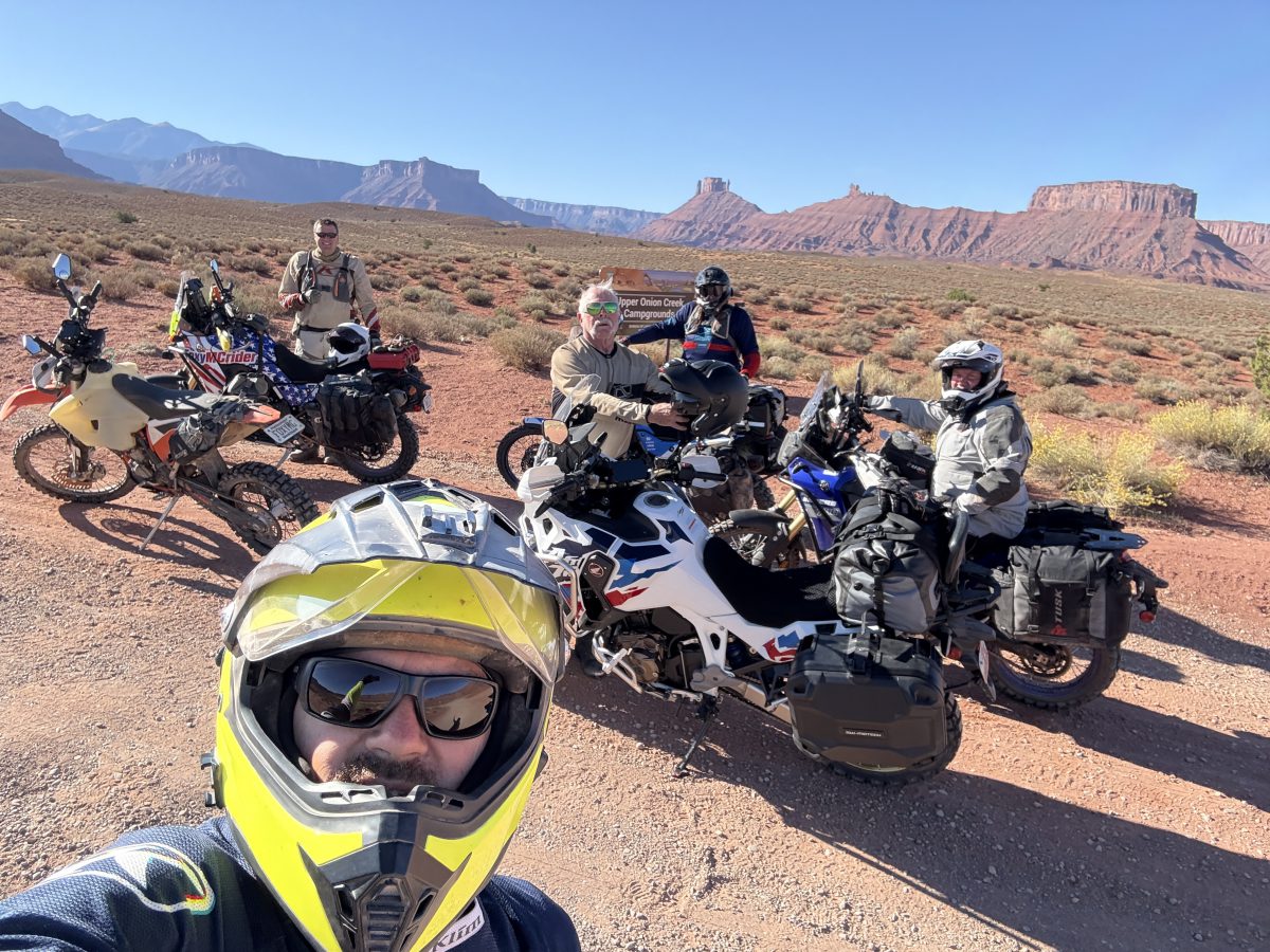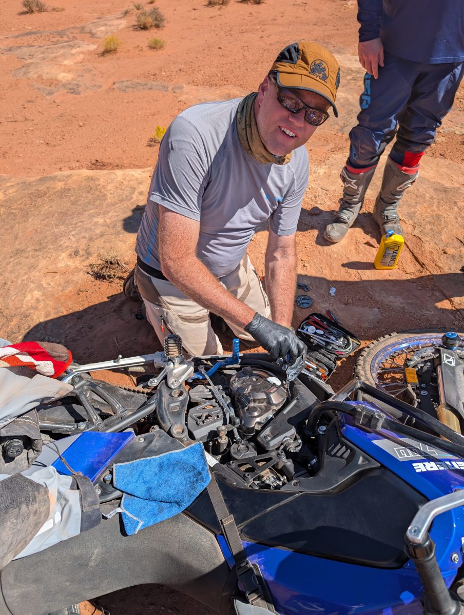 DAY1: White Rim Trail with John, Bob, Jason and me. About 70 miles in, Jason crashed and hurt his ribs and bike. The bike leaked a ton of oil through the side case with about 1/2″ hole. I took the side case off with the bike on its side and used Epoxy Putty to weld it closed again. After 45 minutes I put the bike back together and added 1 quart of normal motor oil.